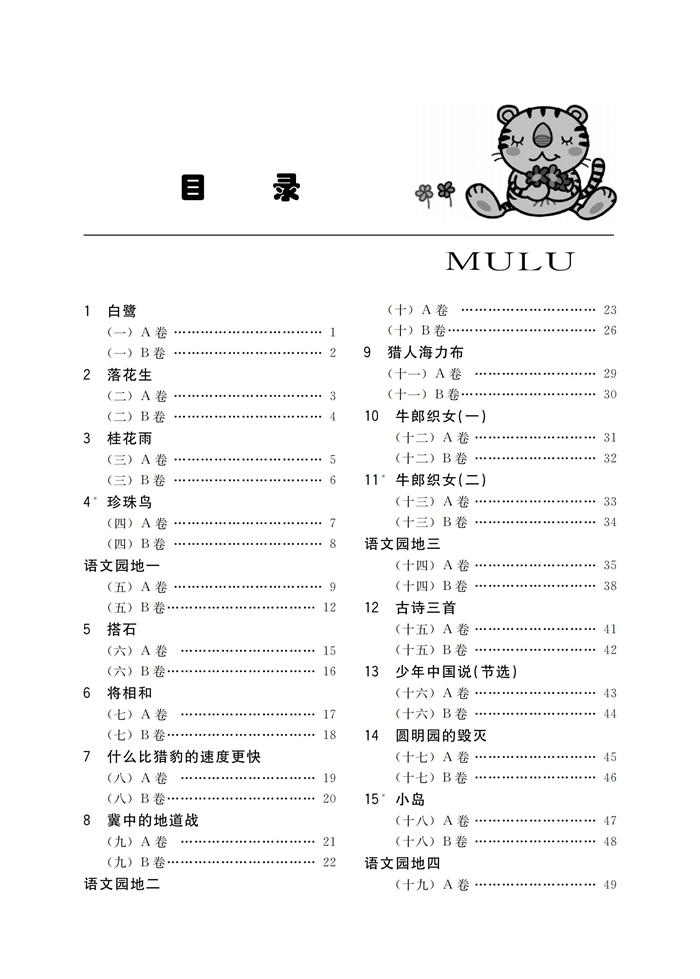 本书与教材内容同步,共有8个单元,每课分A、B卷,A卷巩固课内知识,B卷适度拔高。配有单元检测题和期中、期末检测题,帮助学生阶段性地总结、巩固。题型一般有写字、组词、造句、短文阅读、写作等,帮助学生夯实基础、提高语文素养。
