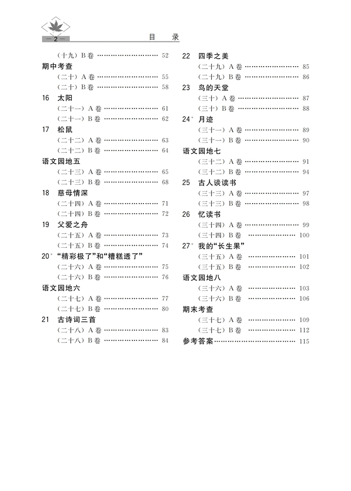 本书与教材内容同步,共有8个单元,每课分A、B卷,A卷巩固课内知识,B卷适度拔高。配有单元检测题和期中、期末检测题,帮助学生阶段性地总结、巩固。题型一般有写字、组词、造句、短文阅读、写作等,帮助学生夯实基础、提高语文素养。